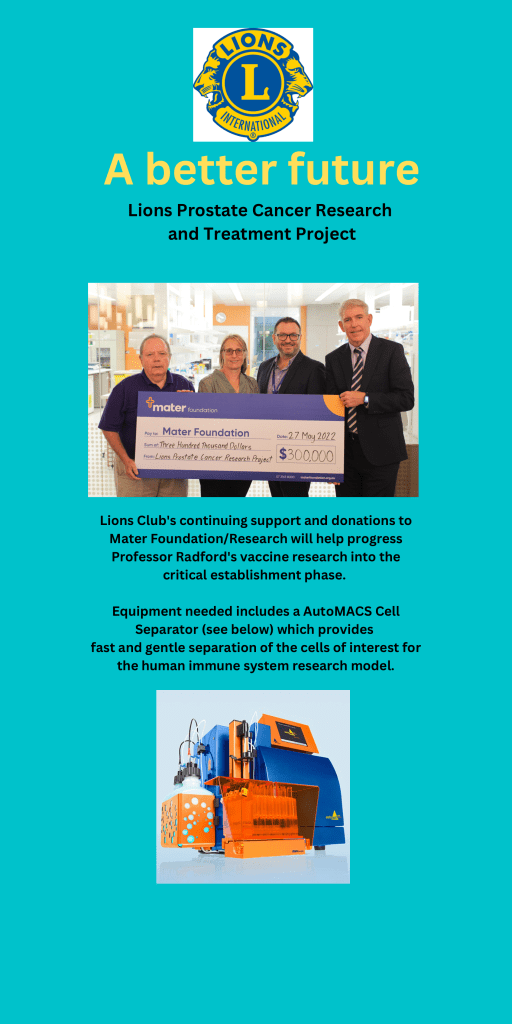 Having supported Mater for more than 20 years, Lions Clubs of Australia initially supported the Queensland Cord Blood Bank (QCBB) at Mater Research and most recently, the Mater Prostate Cancer Research laboratory (MMRI) and now Mater Research.