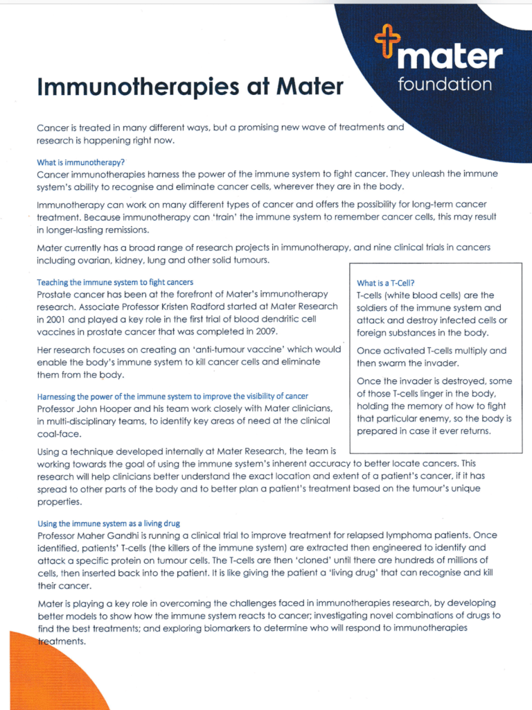 Mater currently has a broad range of research projects in immunotherapy, and nine clinical trials in cancers including ovarian, kidney. lung and other solid tumours.